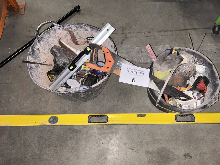 lot handgereedschap w.o. 2 waterpassen, handzaag, kuip, emmer enz.