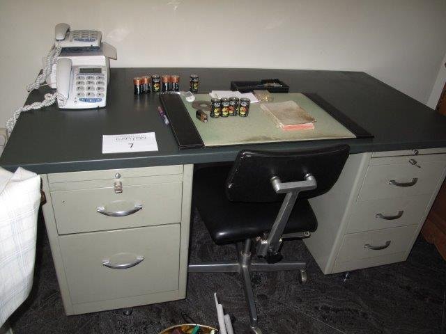 Lotnummer 7 metalen bureel metalen bureel met 2 ladenblokken, stoel, 2 telefoons Maestro 6040 en divers Deze veiling is afgelopen