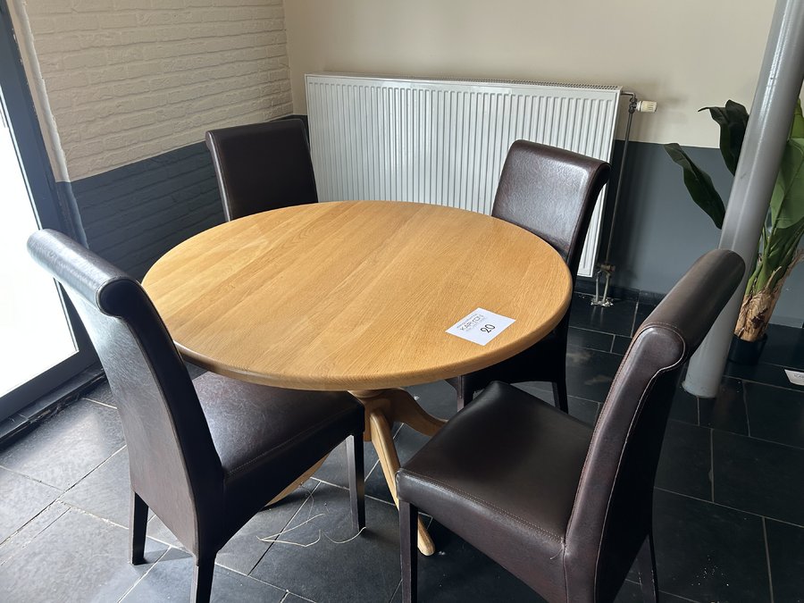 4 stoelen in bruin lederlook met houten ronde tafel diameter 120 cm
