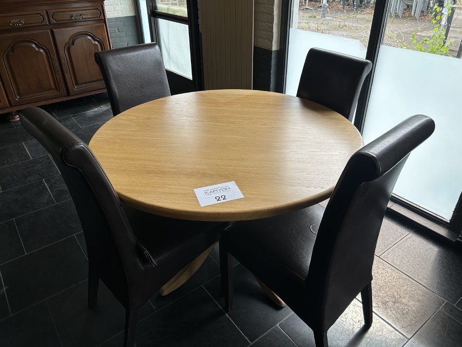 4 stoelen in bruin lederlook met houten ronde tafel diameter 120 cm