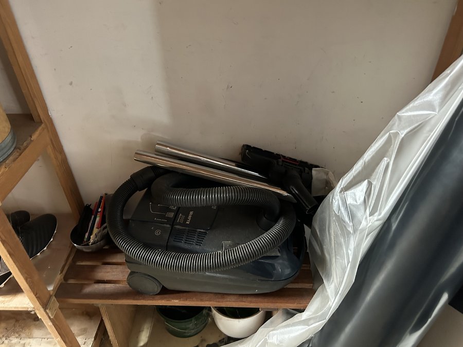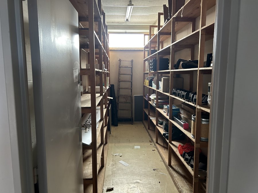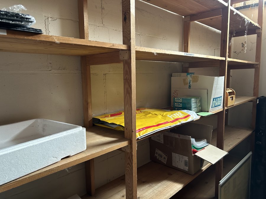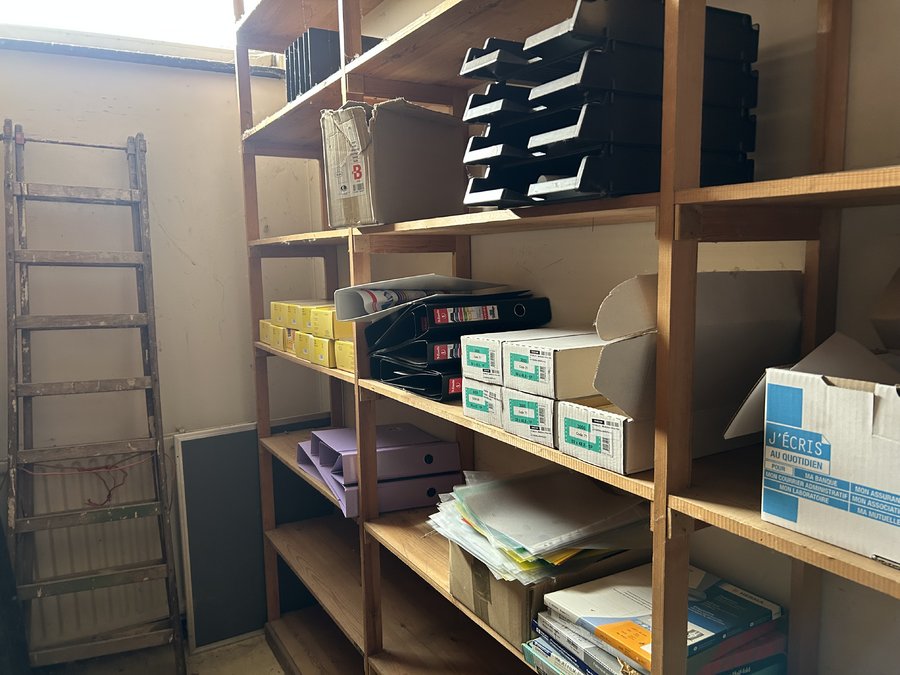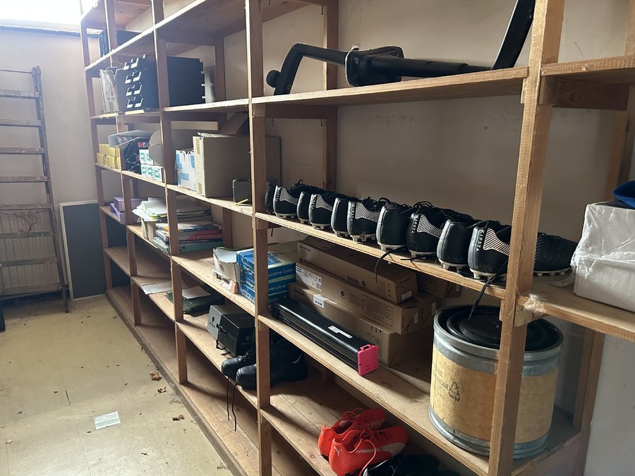 inhoud lokaal met houten rekken, kantoormateriaal, voetbalschoenen en divers